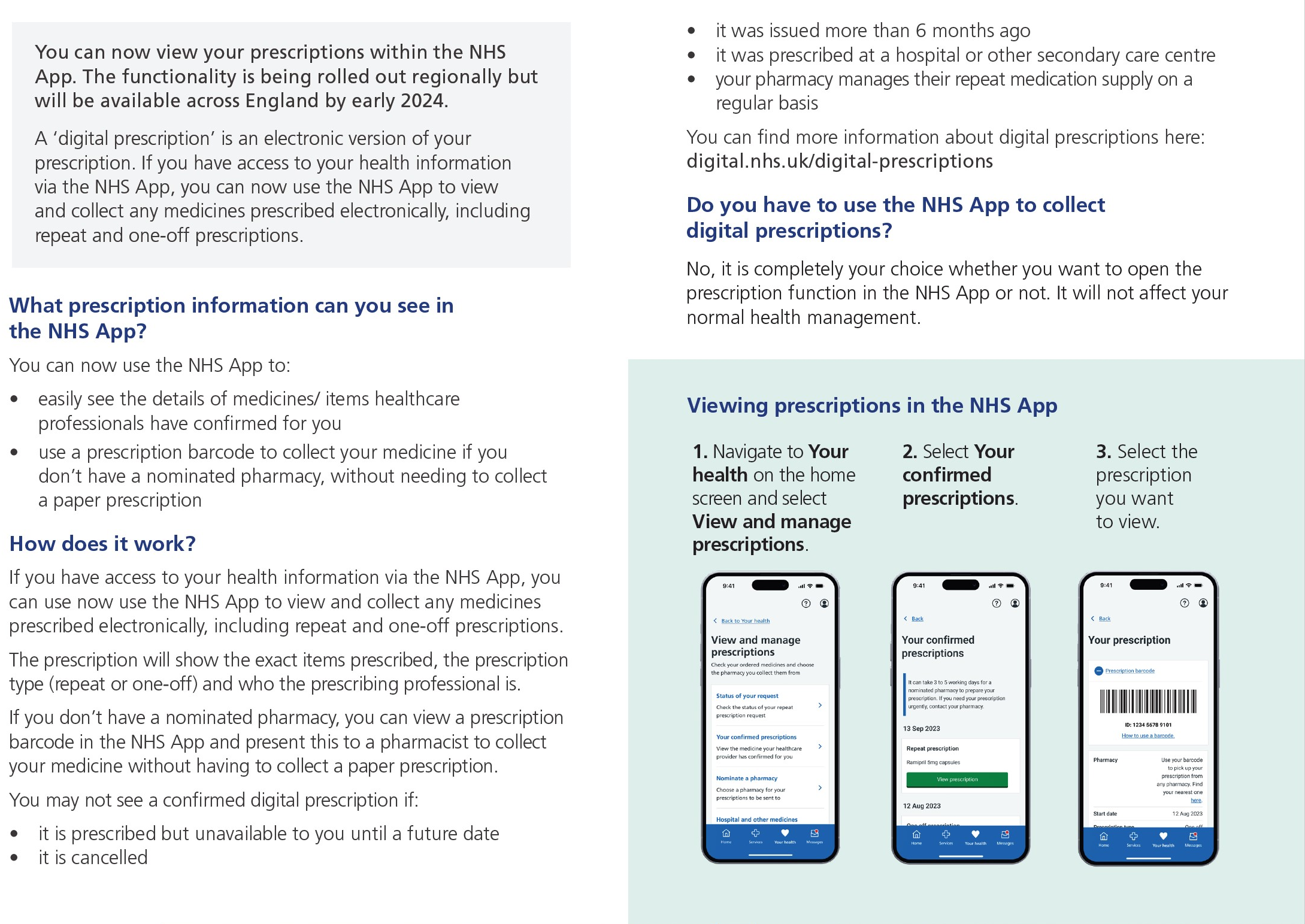 If you have a query about a missing prescription, please use the NHS App to help provide you with the barcode which confirms when for that prescription. This can then be shown to the Pharmacy to help retrieve your medication. Please read the following leaflet for more information: