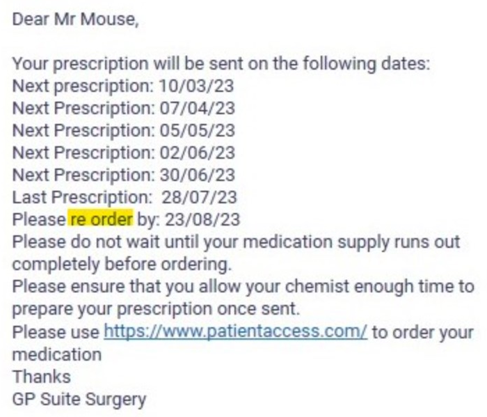 If you are ordering your medication and have already been set up on an 'Extended Prescribing' scheme, then please be mindful of when you need to re-order the next cycle of medication. As mentioned above, you will receive a text message/e-mail when the medication has been issued via this scheme confirming the dates of when the prescriptions will be sent to your nominated Pharmacy. The text message will include a 're-order' date (see below). This is date by which you need to request your next cycle of medication. If you order too early, the request will be rejected and you will have to re-submit the request nearer the re-order date.