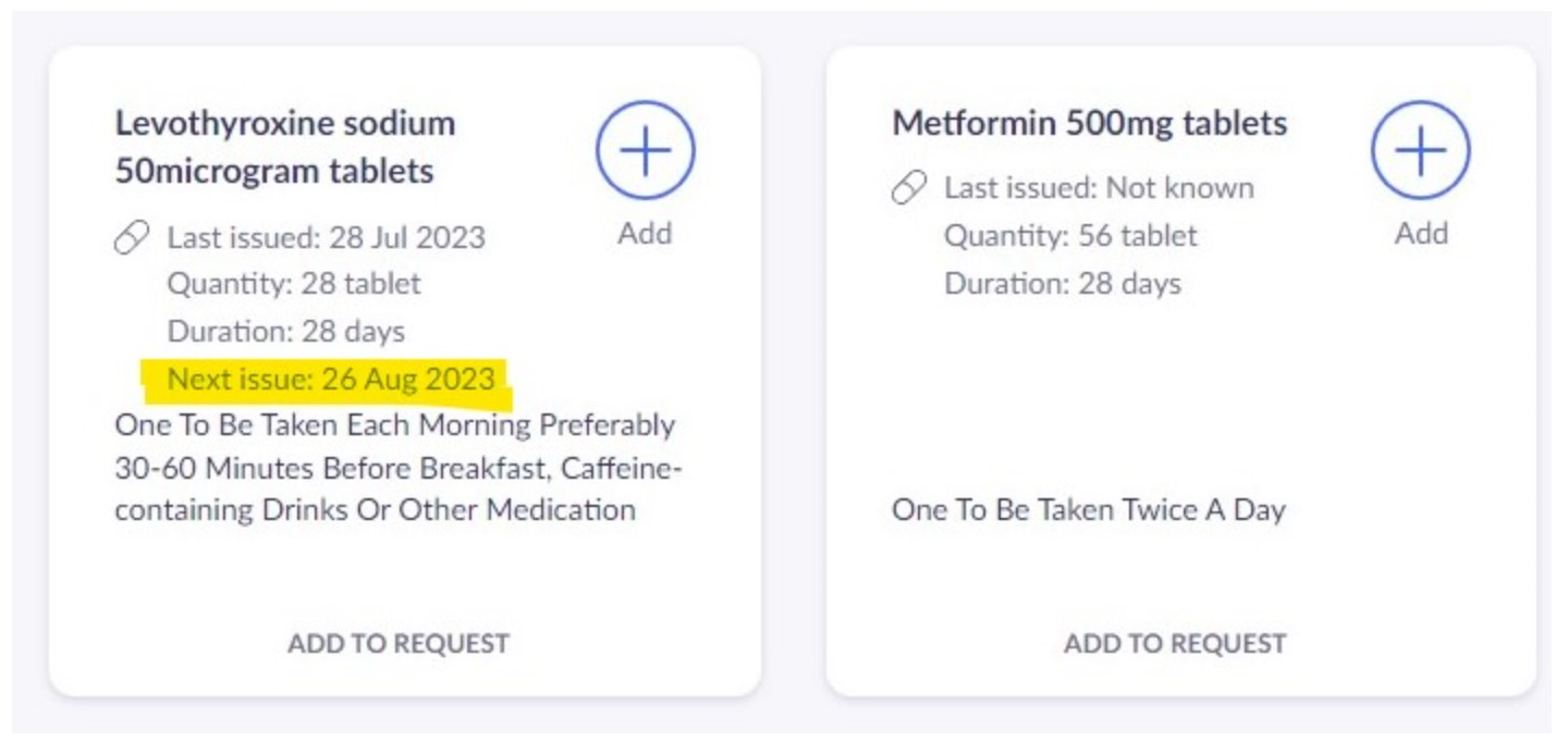 The date of when the prescription is next due to be issued is also available on Patient Access. Please remember that the 're-order' date you receive on the text message/email is specifically set 48 hours before the 'Next issue' date (see below) and is for your benefit and to act as a reminder so that you do not run out of medication for when it is next due.