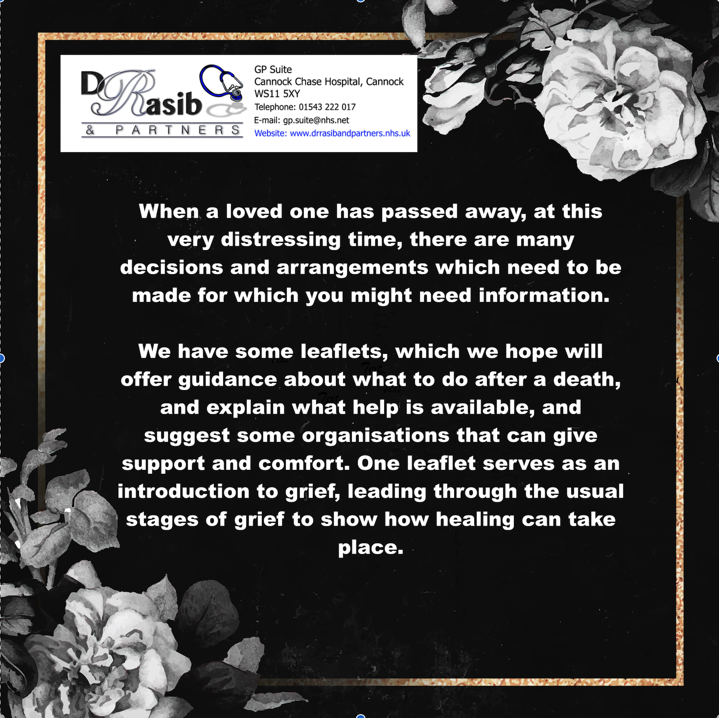 We hope that the information on the following link will be helpful to you in dealing with some of the practicalities following the death of a partner, relative or close friend at this difficult time. We have Clinicians that are available to speak to, or see you, if you need to talk about any aspect of your recent bereavement. Please do not hesitate to contact the surgery.